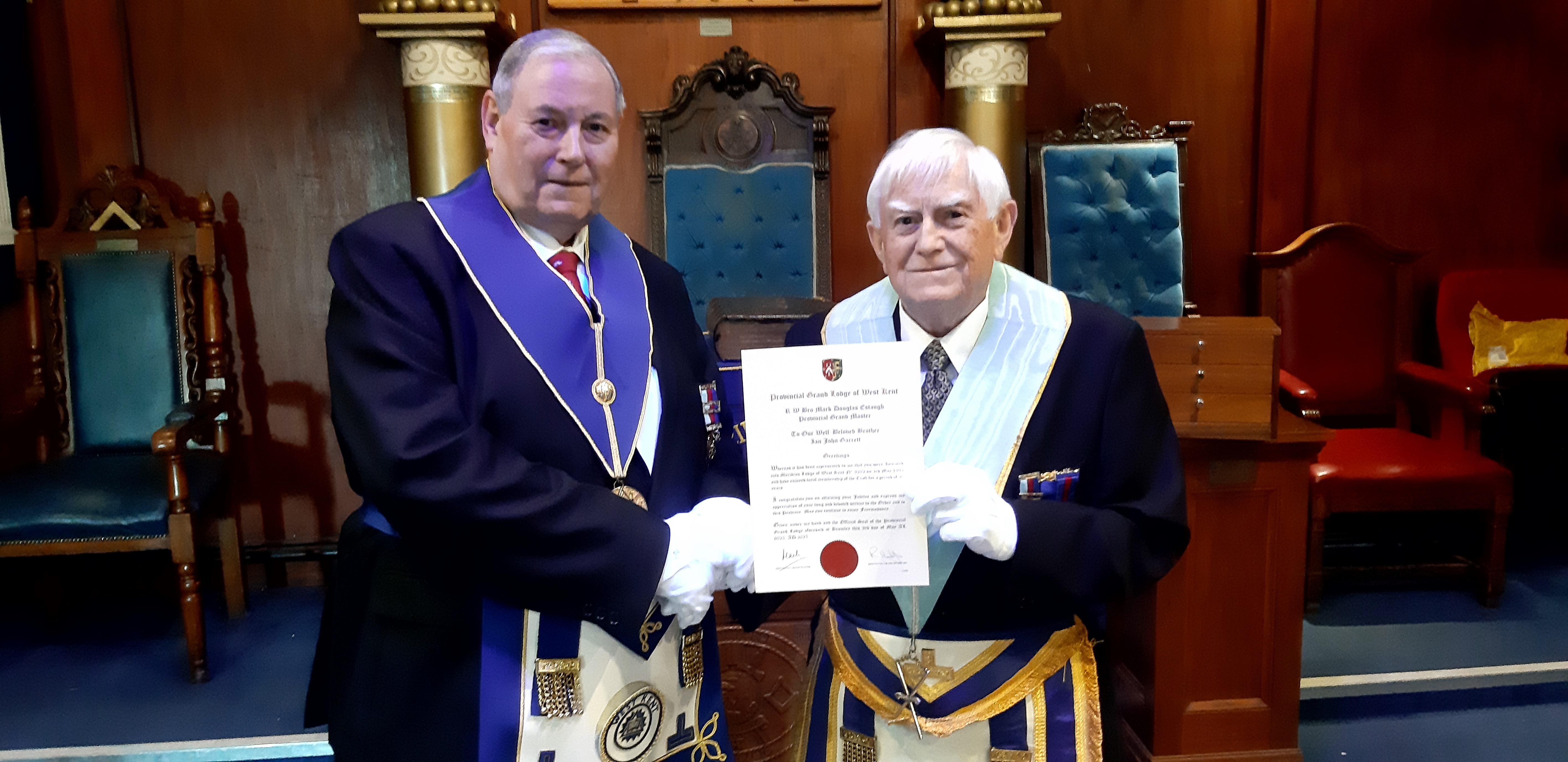 W.Bro. Ian J. Garrett receiving his 30 year citation from W.Bro. Ray Armstead ProvGChap