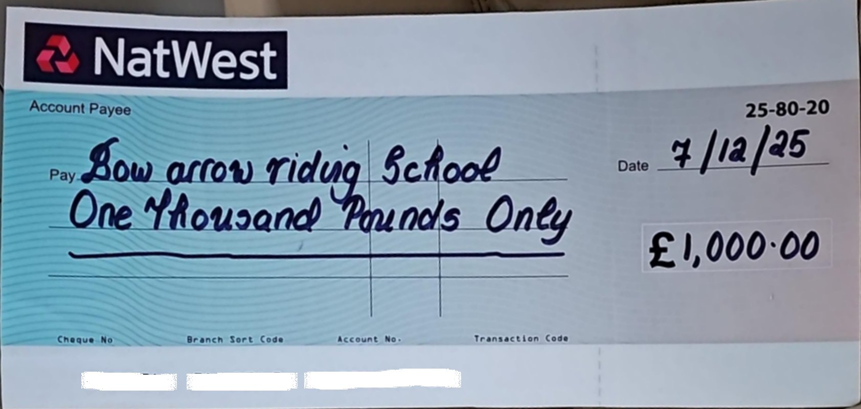 £1000 Cheque presented Arrow riding school 7th December 2025